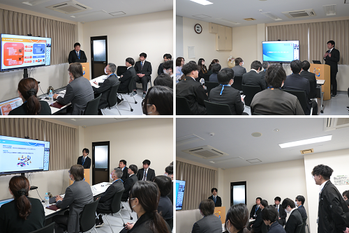 本年度は3名の社員が、それぞれが携わったプロジェクトを通じて得た知識や反省点などをスライドにまとめ、発表を行いました。